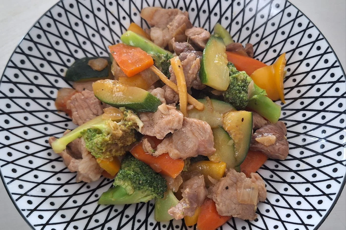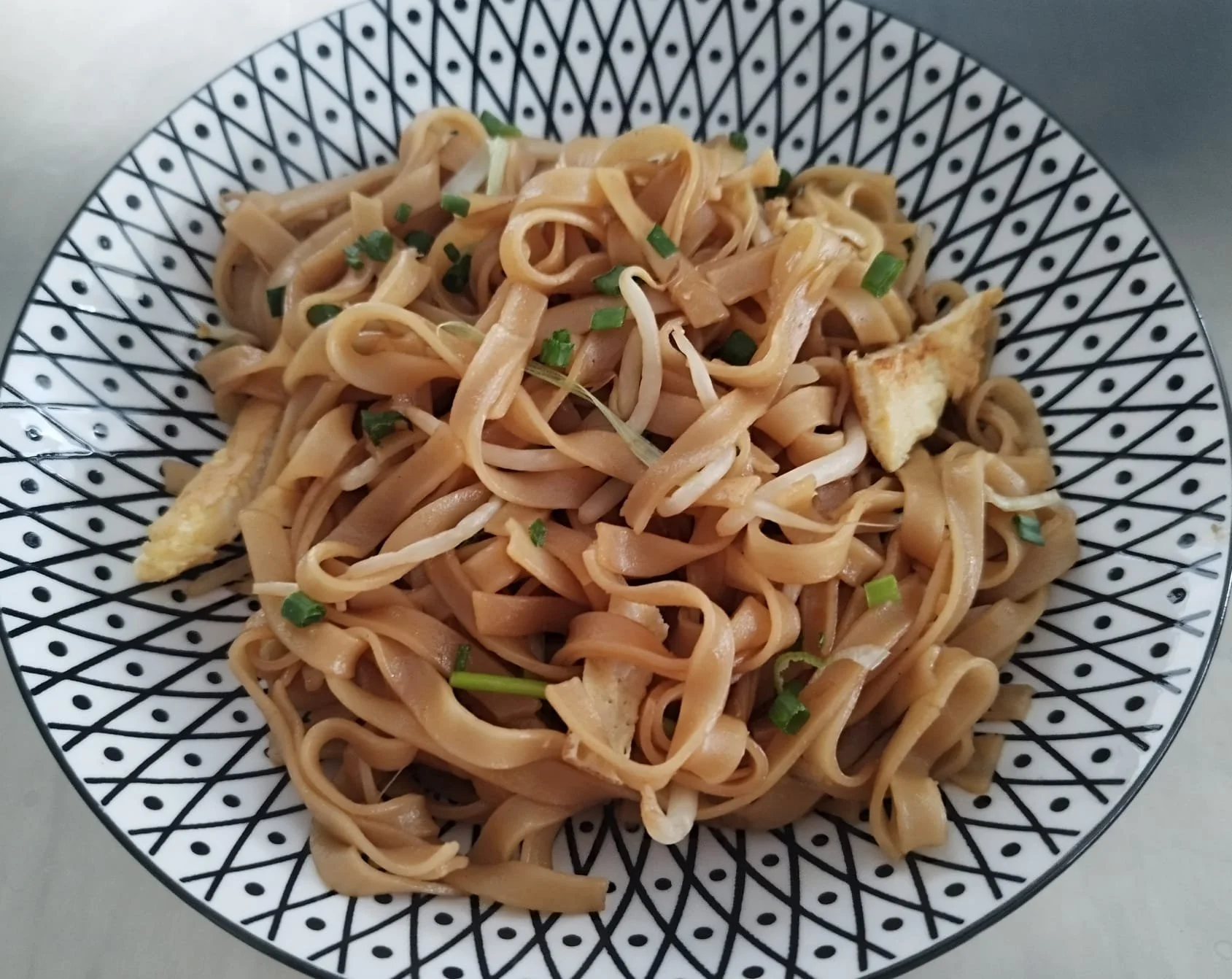 Nouilles sautées aux légumes (poivron rouge, carotte, pousse de bambou, courgette) et œufs.