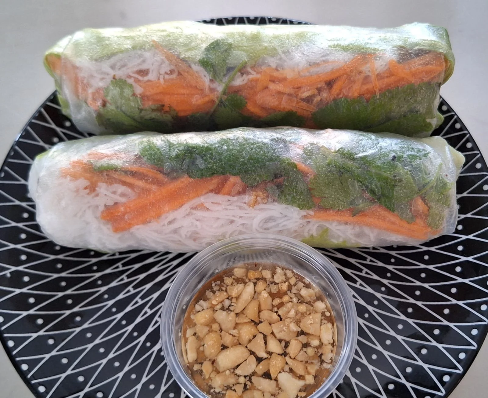 Un rouleau frais et croquant garni de poulet mariné, vermicelles de riz, salade, carotte, concombre, coriandre, menthe et une touche d'oignons frits pour la gourmandise.