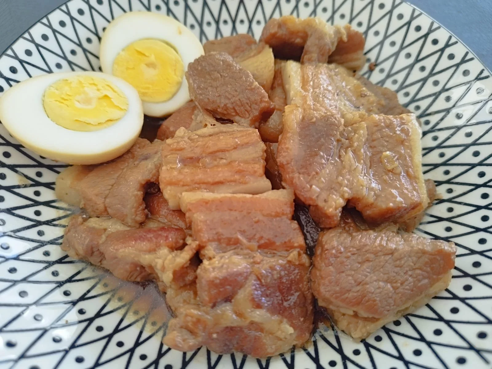 Morceaux de poitrine de porc mijotés dans une sauce asiatique caramélisée, accompagnés d’œuf dur imprégné des saveurs du plat. Servi avec du riz jasmin parfumé.