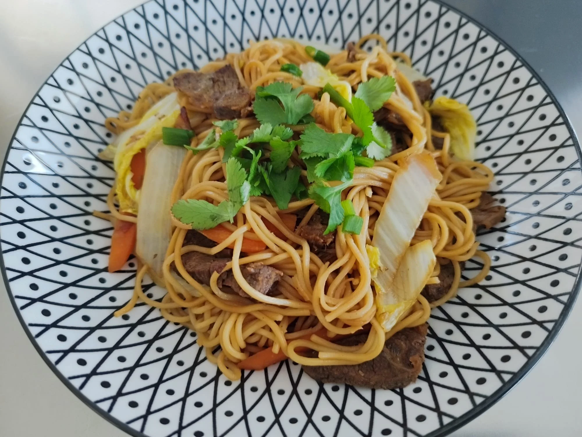 Nouilles sautées au wok avec du bœuf mariné et des légumes.