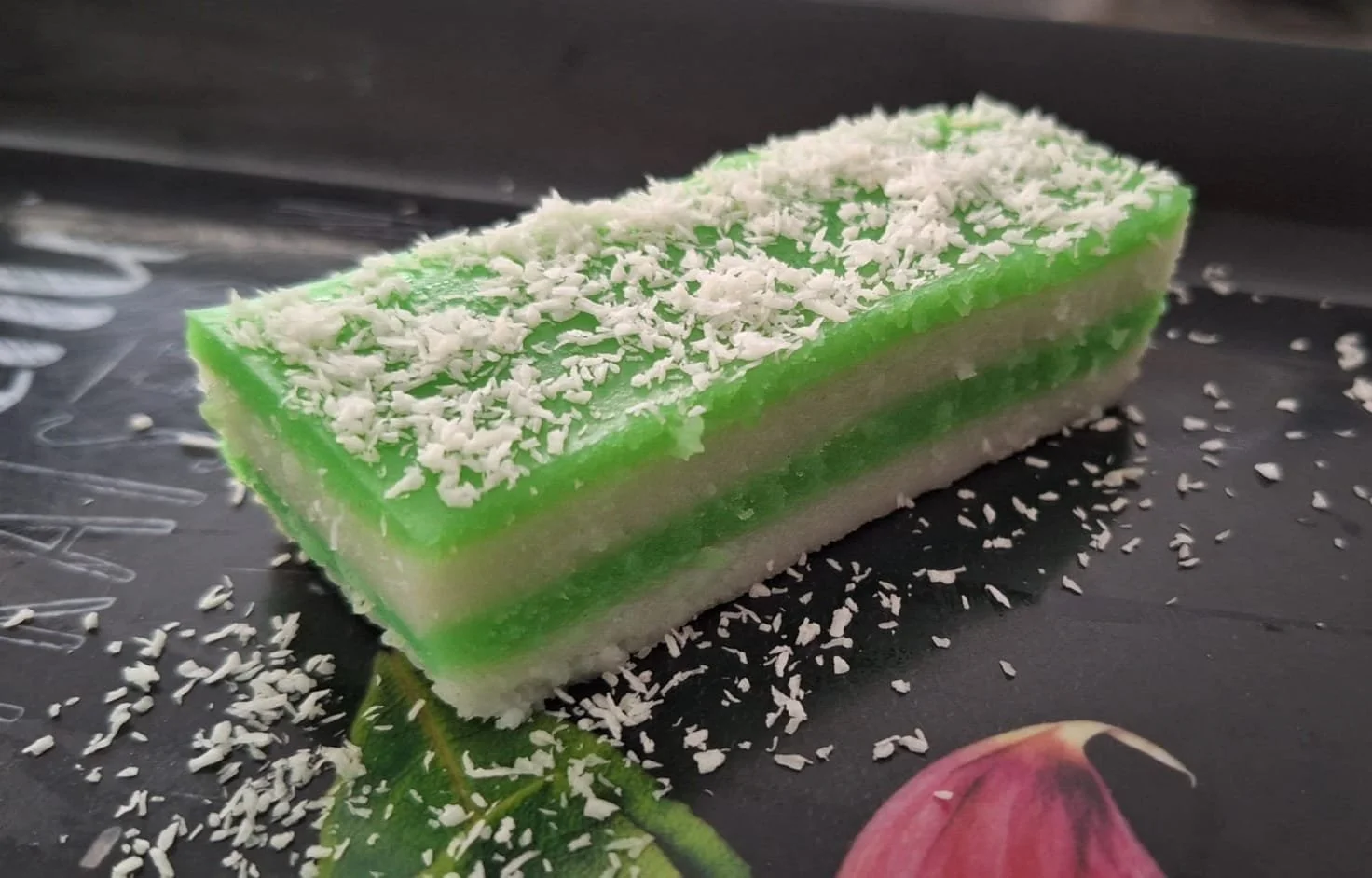 Dessert emblématique d’Asie du Sud-Est, ce gâteau à la fois fondant et élastique à un gout unique au pandan et parfumé à la noix de coco.