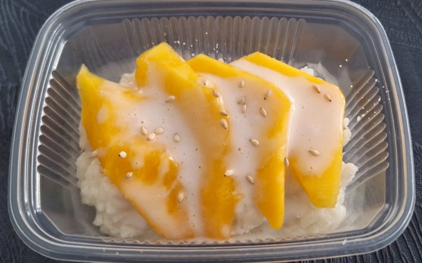 Du riz gluant cuit à la vapeur, imprégné de lait de coco et accompagné de mangue fraîche.