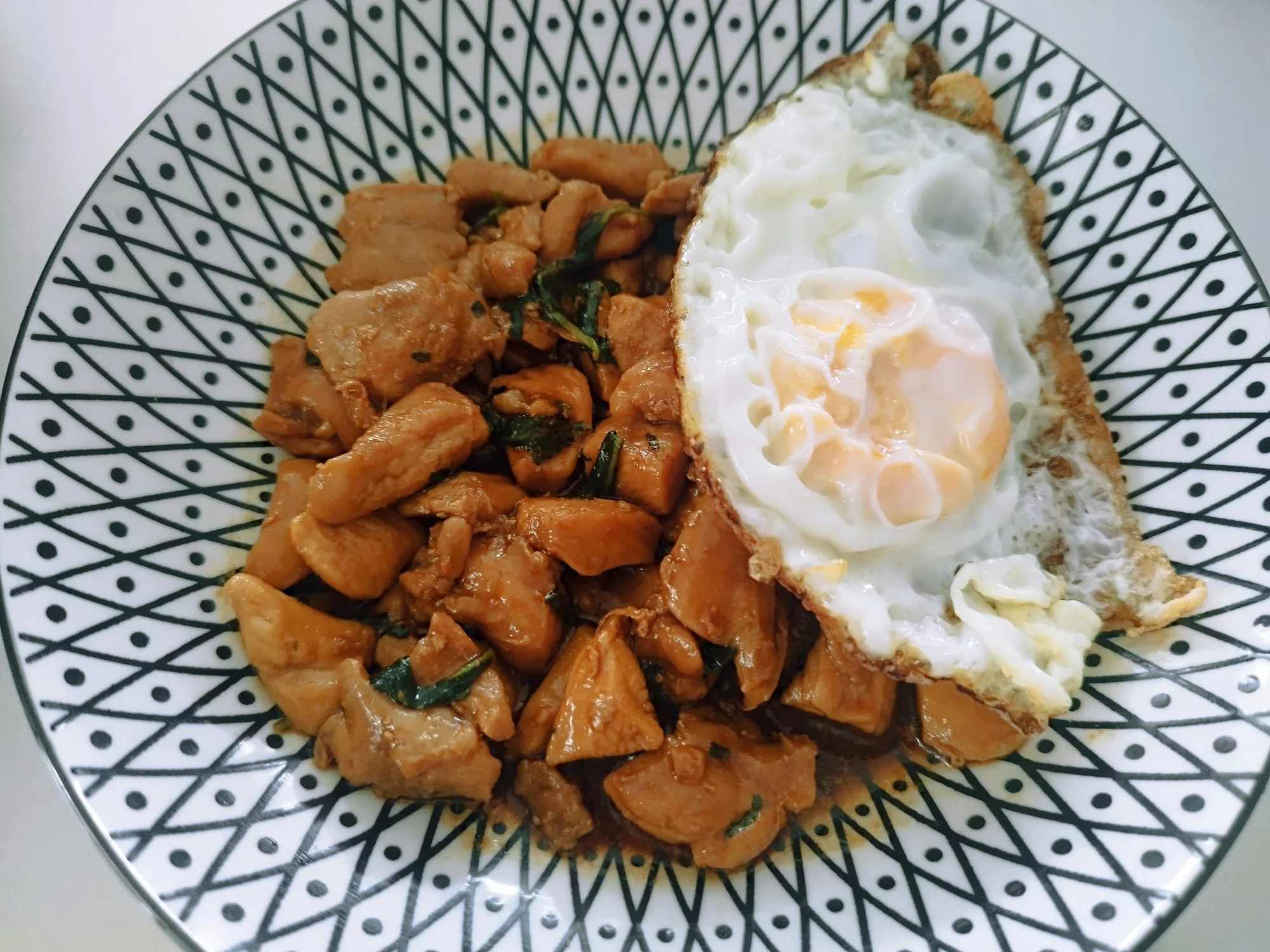 Poulet sauté au wok avec du basilic thaï, servi avec un œuf frit et du riz parfumé.