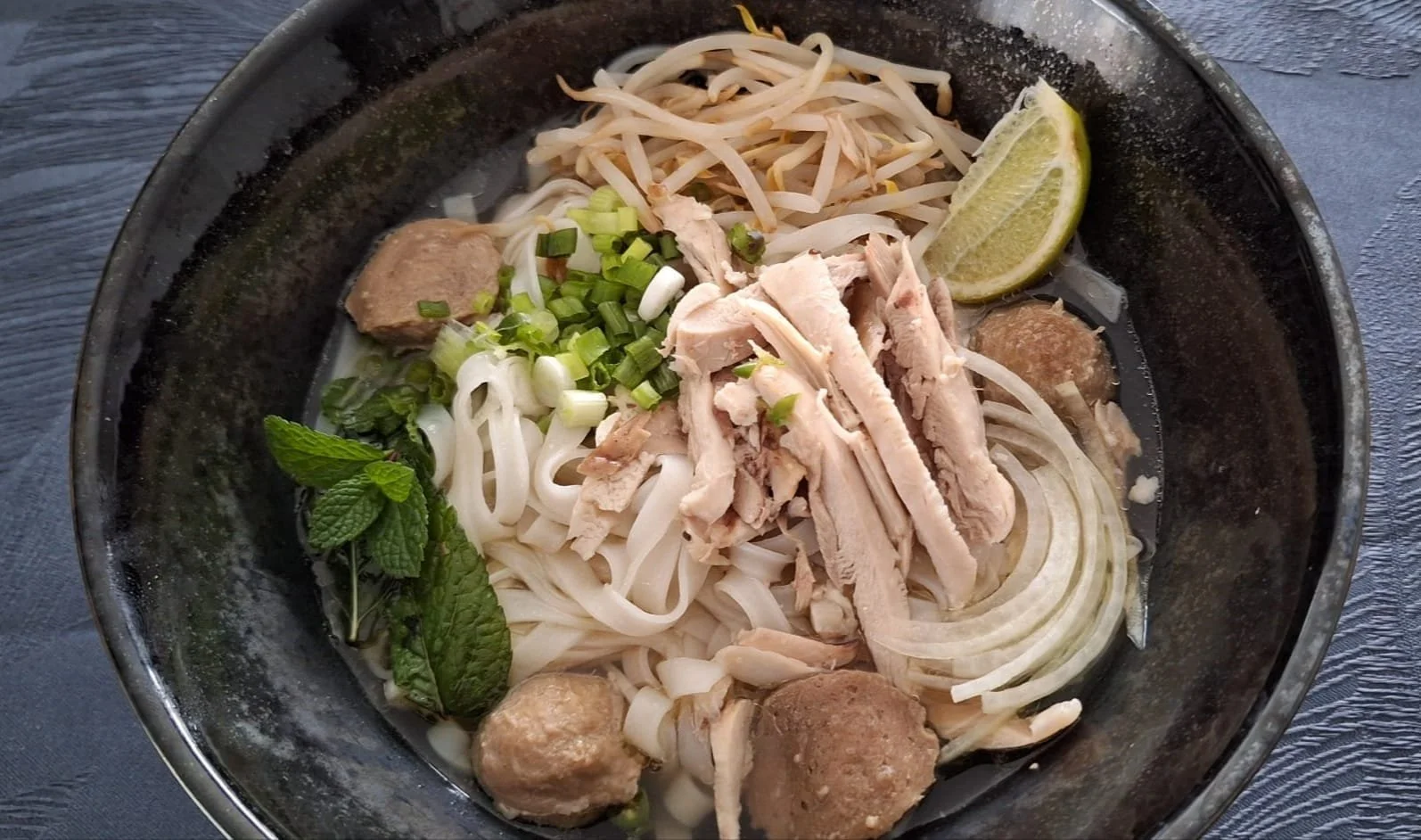 Bouillon parfumé, garni de tranches de poulet, boulettes de bœuf, pousses de soja et un mélange frais d’herbes asiatiques. Accompagnés de vermicelles de riz.