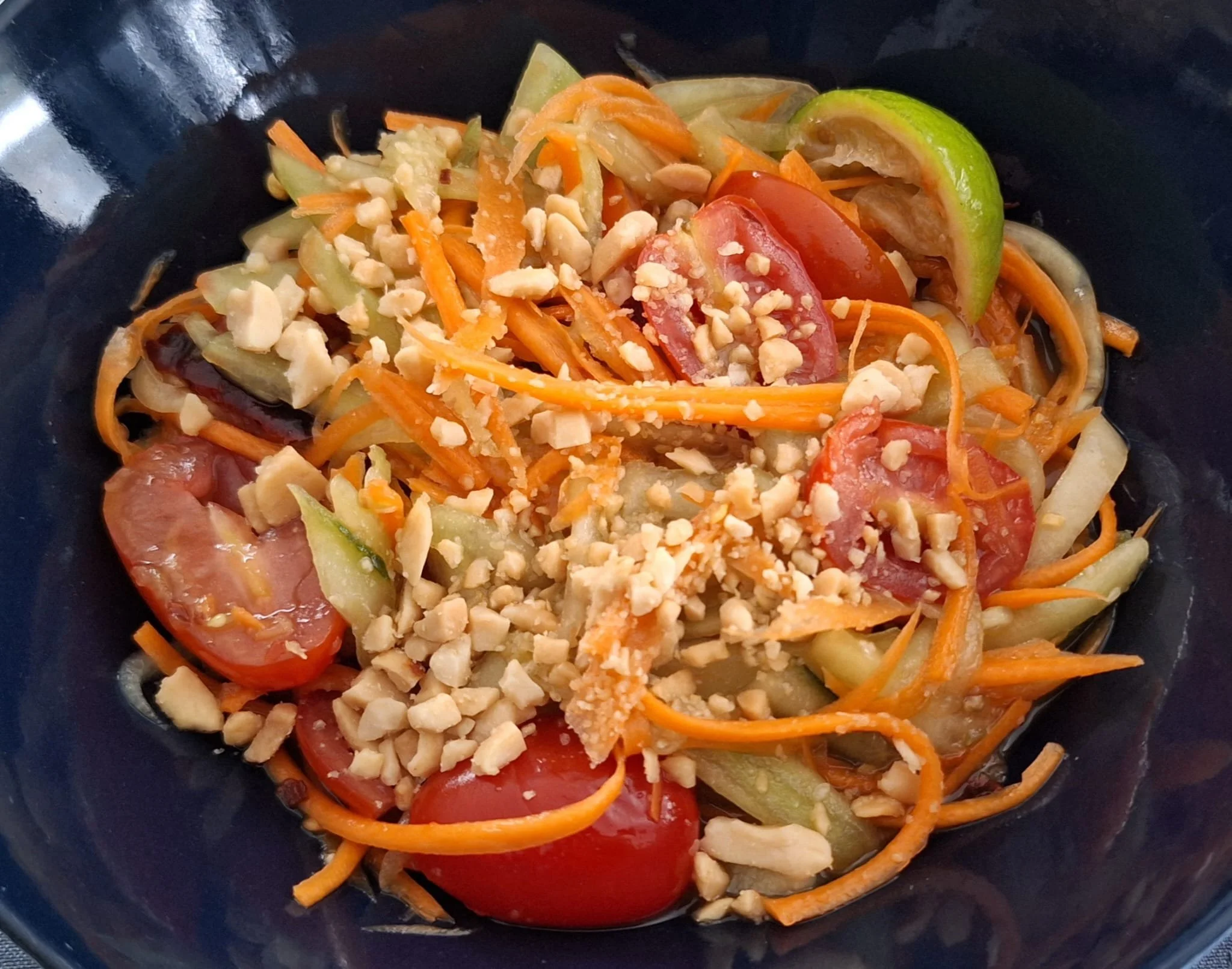 Salade croquante de carottes, concombres et tomates. Petite sauce acidulée au citron vert et à la sauce poisson, parsemée de cacahuètes pilées. Légèrement épicée.